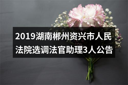 为进一步充实人员力量,加大人才引进力度,改善法院法官助理队伍结构,根据工作需要,资兴市人民法院决定面向全省公开择选择调法官助理3名,现将有关事项公告如下: