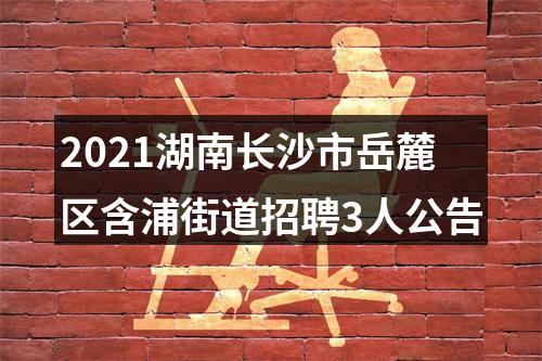 长沙市岳麓区含浦街道办事处,是长沙市岳麓区人民政府的派出机构,面积51.17平方公里,下辖4村1社区,总人口2.67万人。因工作需要,现面向社会公开招聘工作人员3名。现将有关事项公告如下: