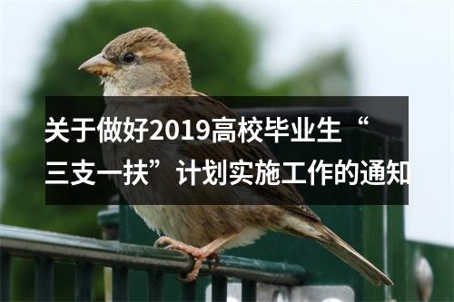 为贯彻落实中共中央办公厅、国务院办公厅印发的关于进一步引导和鼓励高校毕业生到基层工作的意见,按照《中共中央组织部 人力资源社会保障部等九部门关于实施第三轮高校毕业生“三支一扶”计划的通知》(人社部发﹝2016﹞41号)安排,现就做好2019年高校毕业生“三支一扶”计划实施工作通知如下: